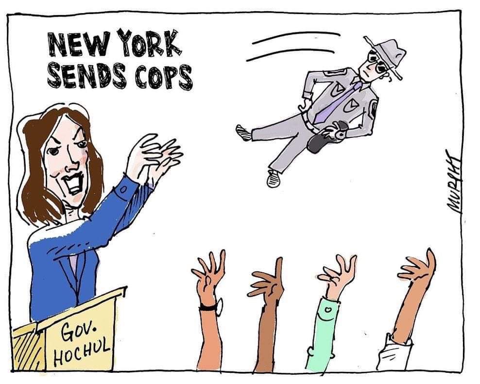 Nuestra organización A Call For Action To Puerto Rico tiene como aliada a la Asamblea de Trabajadores contra el Racismo. El artista Tony Murphy hizo esta gráfica de la gobernadora Kathy Hochul de Nueva York que en vez de enviar suministros o personal médico, envió policías.