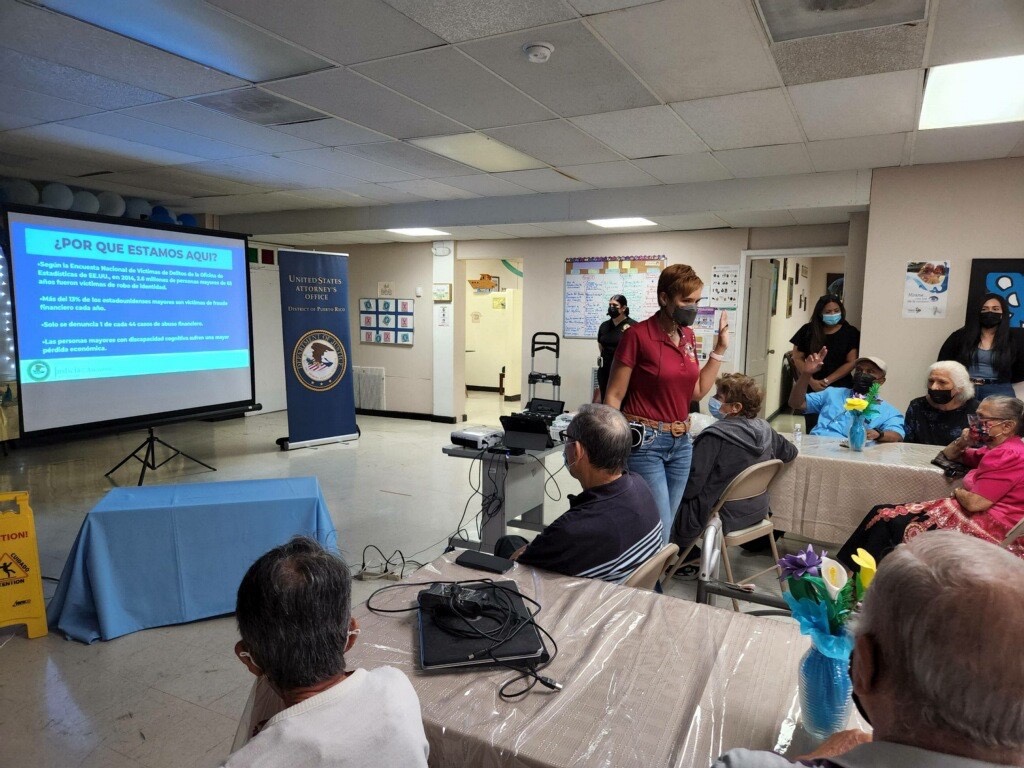 Como parte de los esfuerzos de fraude de ancianos del Distrito, nuestro personal participó en la divulgación de orientación a la comunidad para crear conciencia sobre las estafas y la explotación, y para prevenir la victimización. Este año, la División PACE de USAO-Puerto Rico celebró una serie de seminarios de prevención del delito en los Centros de Actividades Múltiples para Personas Mayores (conocidos en español por el acrónimo de «CAMPEA») gestionados por el Departamento de Familia en toda la isla.