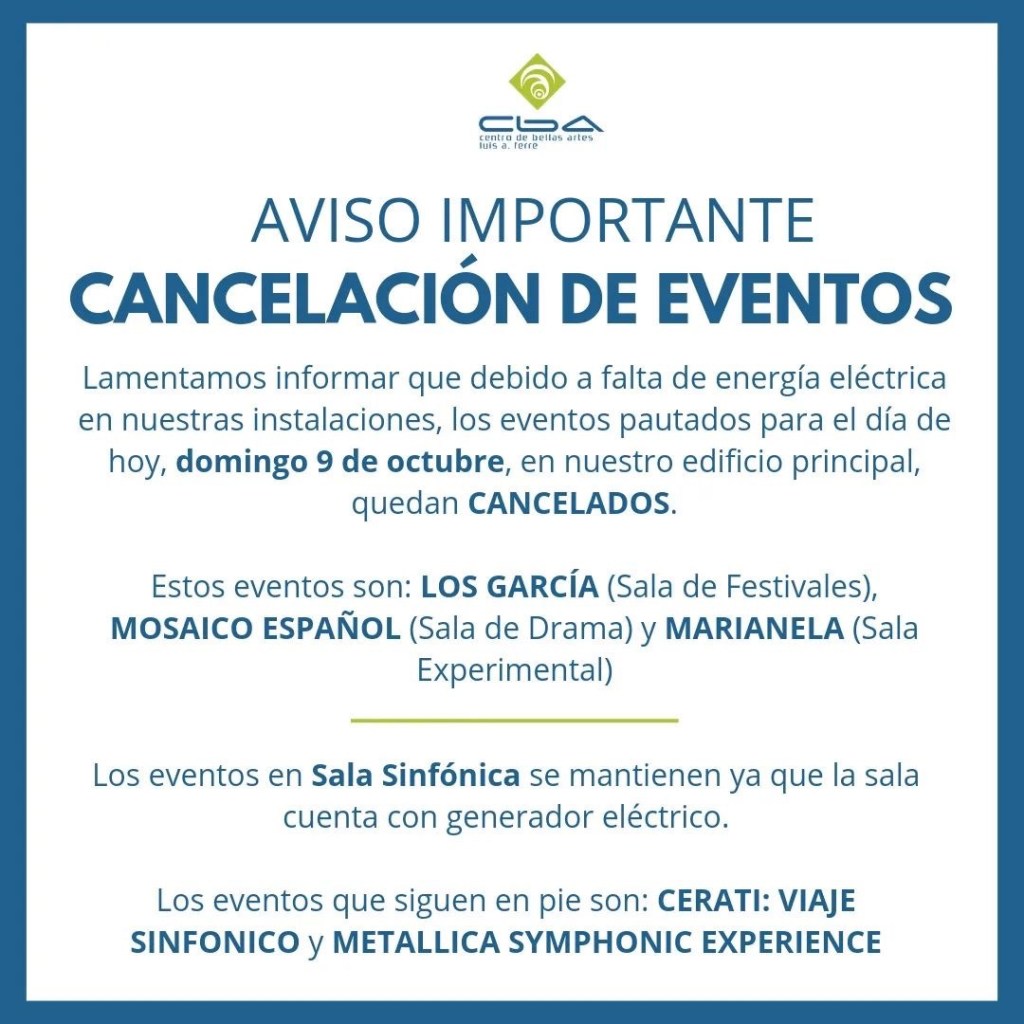 “Lamentablemente, acabamos de ser notificados por el Centro de Bellas Artes de Santurce que, nuestra función pautada para el día de hoy está cancelada y debe ser pospuesta por falta de energía eléctrica. Ante esto, anunciamos a todo el público que había adquirido sus boletos que la reprogramación será el próximo sábado, 15 de octubre a las 4:00pm. Es una situación fuera de nuestro control y lamentamos mucho que así sea”, explicó el licenciado Juan R. Ward Cid, productor general del proyecto.