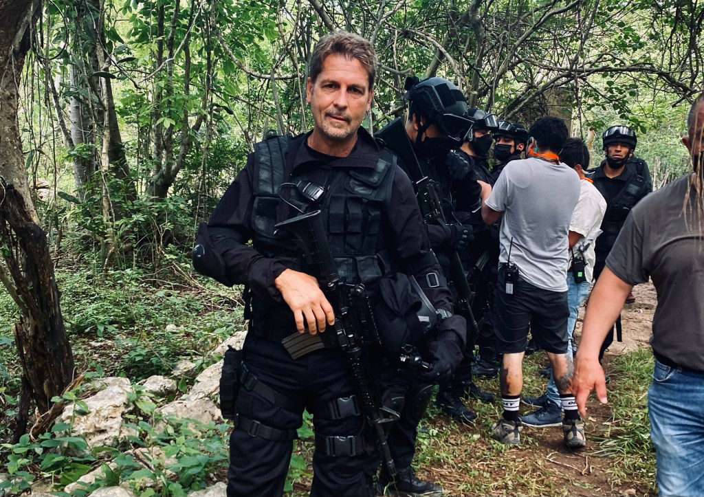 El personaje de Ernie Palermo filmando en la selva de Yucatán.