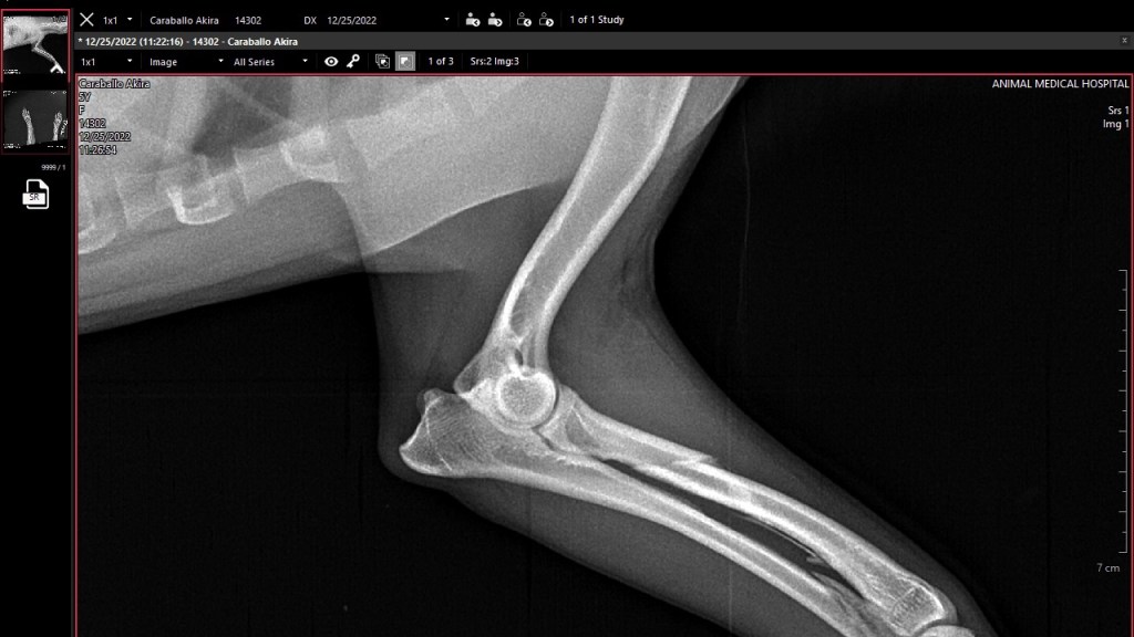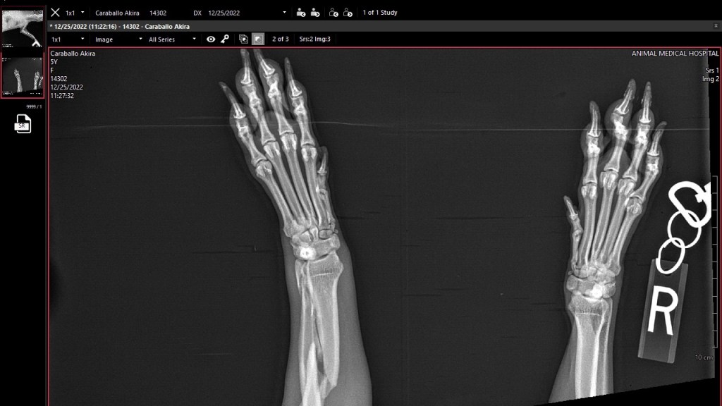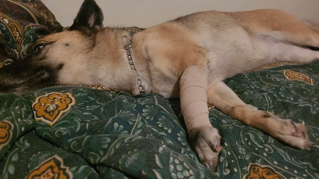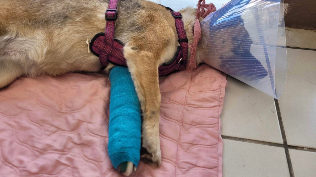 La abrazadera, los calmantes y el aceite de cáñamo no la tranquilizaron. Su familia la buscó y cuando la hallaron una de sus patitas delanteras estaba fracturada y sus quejidos de dolor estremecían sus almas.