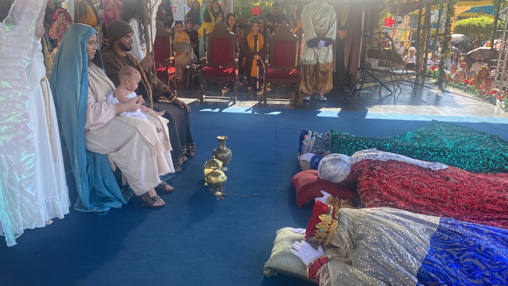 Uno de los momentos más especiales de la celebración religiosa es el momento de la adoración de Gaspar, Melchor y Baltasar al Niño Dios. Este año la pequeña Aurora Isabel Campos Toro, representó al Niñito Jesús.