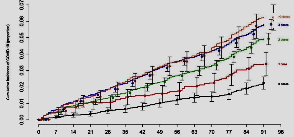 2. Aquellos con 3 o 4 o más dosis tienen 35 veces más probabilidades de ser ingresados en el hospital con Covid que aquellos sin dosis.