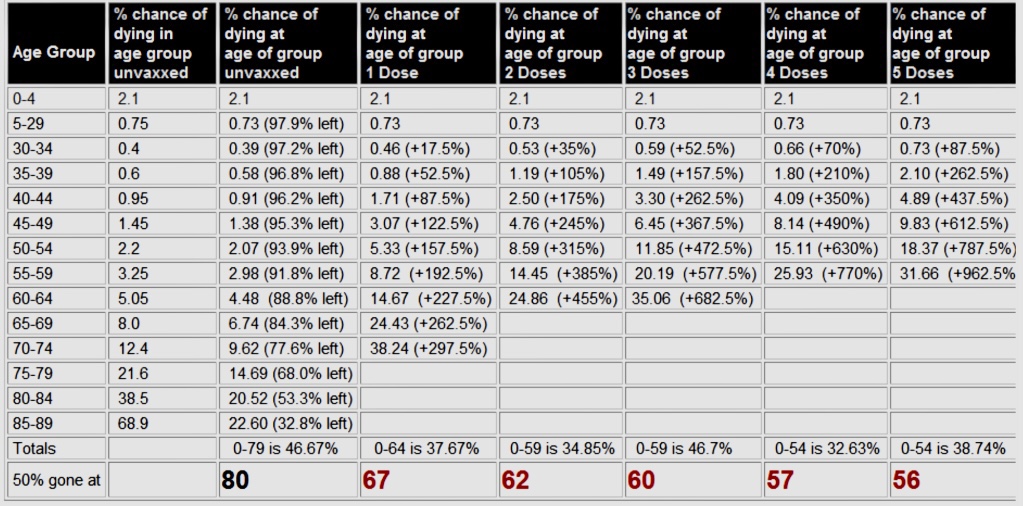 En términos estadísticos, la mitad de su cohorte está muerta a los 80 años. La esperanza de vida de una persona de 30 años cinco veces vacunada en el Reino Unido es de 56 años. Suponiendo que los hombres del Reino Unido respondan a las vacunas de la misma manera que los estadounidenses. Alternativamente, los hombres estadounidenses de 30 años de edad, con cinco pinchazos, también han perdido 24 años de esperanza de vida.