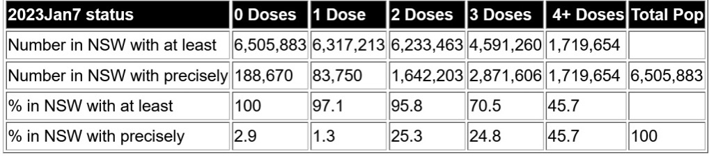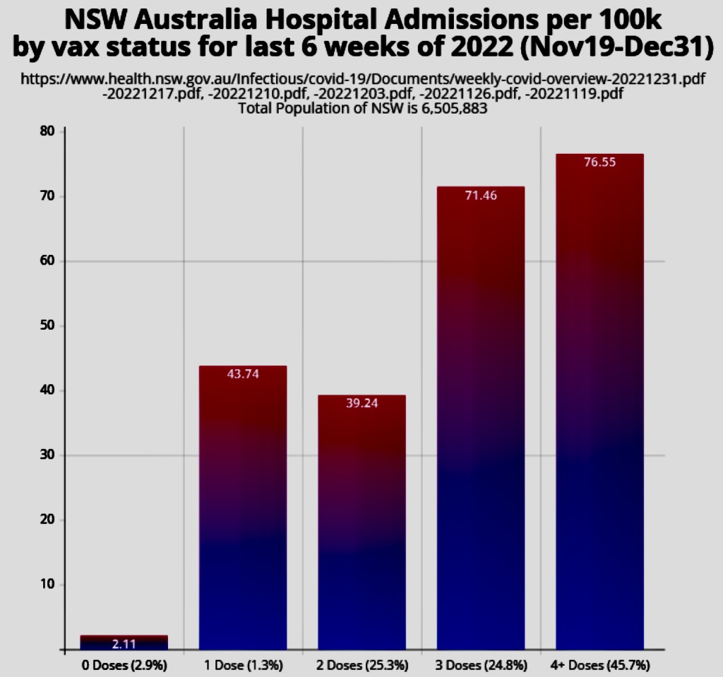 La población de Nueva Gales del Sur en Australia es de 61/2 millones de personas. Son un grupo altamente vacunado. Mirando los datos del gobierno australiano para las últimas 6 semanas de 2022, vemos eso.