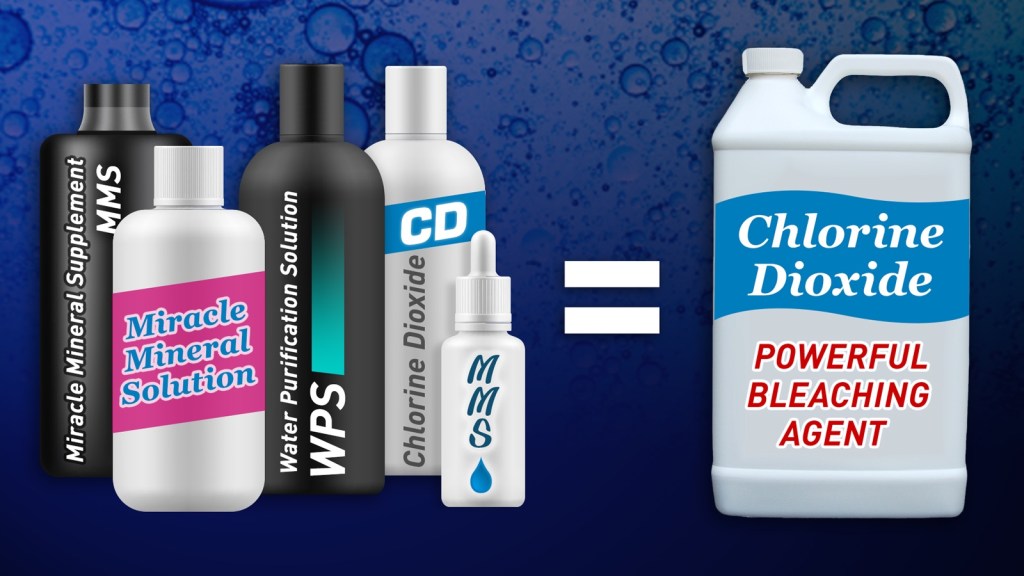 La FDA ha advertido previamente a los consumidores que no compren o tomen productos de dióxido de cloro que se venden en línea como tratamientos médicos, ya que la agencia no tiene conocimiento de ninguna evidencia científica que apoye su seguridad o eficacia, y presentan riesgos considerables a la salud de los pacientes.