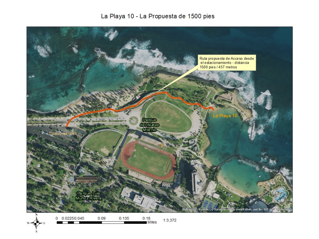 • El proyecto como propuesto anula la posibilidad del público al acceso del litoral de la Playa 10 de la Isleta de San Juan y que ubica en el extremo este del Parque del Tercer Milenio, también conocida como la Pocita del Escambrón. Asi las cosas, y por obviedad, también cierra el acceso de los buzos al mismo espacio. Por tanto, los buzos estarían imposibilitados de practicar su actividad, por ser necesarias esa orilla y vía vehicular para poder manejar, con efectividad, los equipos a utilizarse, cuyo peso ronda entre las 80 a 100 lbs. Al no haber una manera práctica de acercar los mecanismos de transporte a la orilla, los buzos estarían obligados a caminar con tal peso una distancia en exceso de media milla. Nuevamente, esto es «posible» pero evidentemente improbable.