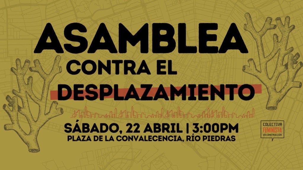 Con el propósito de encaminar trabajos organizativos necesarios para combatir y frenar el desplazamiento en Puerto Rico, la Colectiva Feminista en Construcción convoca al pueblo a participar de la Asamblea Contra el Desplazamiento hoy sábado, 22 de abril a las 3:00pm en la Plaza de la Convalecencia en Río Piedras.