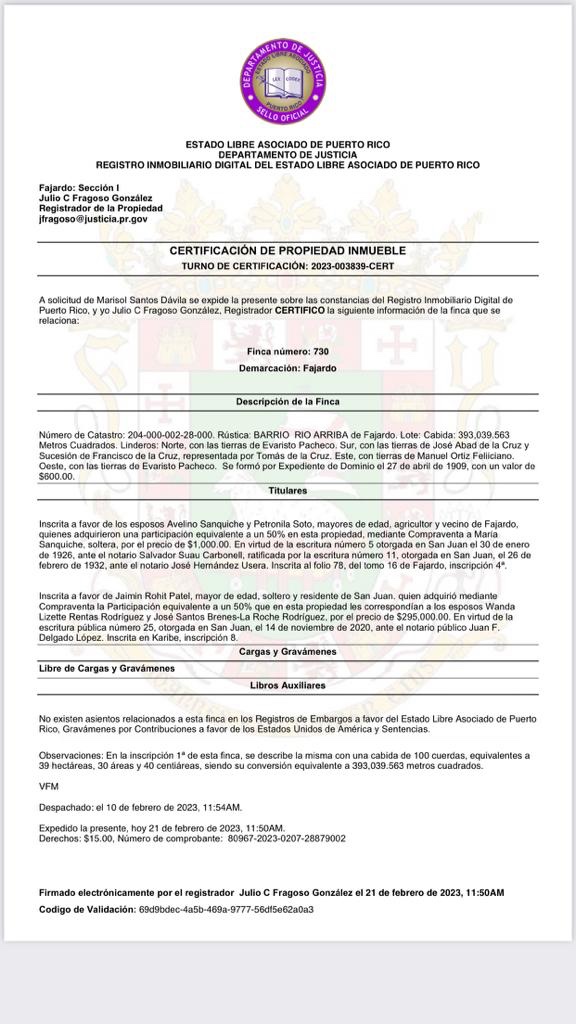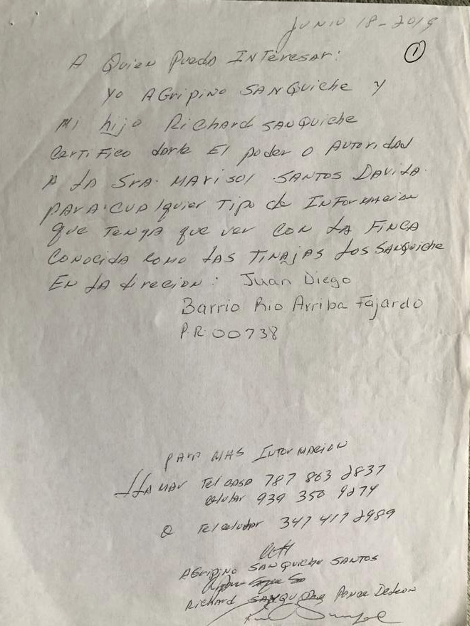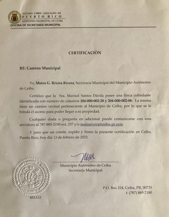 Aparte del documento firmado a puño y letra por Sanquiche padre e hijo que la autoriza y cuya legitimidad jurídica es incuestionable, la señora Santos Dávila tiene en su poder un documento suscrito por la Secretaria Municipal, Moira G. Rivera Rivera que certifica que es custodia de la finca a la que no se le permite acceso.