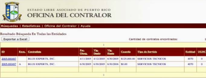 Mientras miraba la base de datos de contratos, me encontré con el nombre de una corporación peculiar para la que Toa Baja tenía un contrato por valor de $125 mil dólares por un período de 2 meses y medio. El nombre de la corporación era «BLUE EXPERTS, INC».