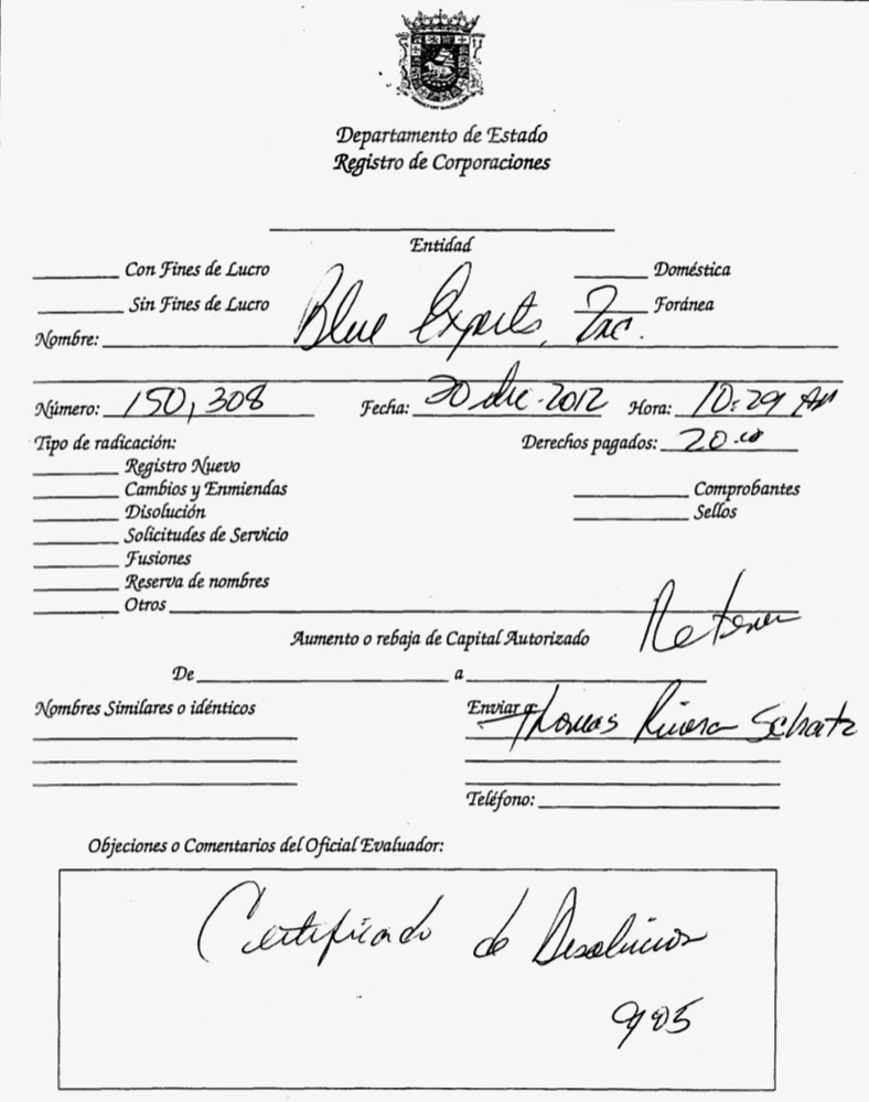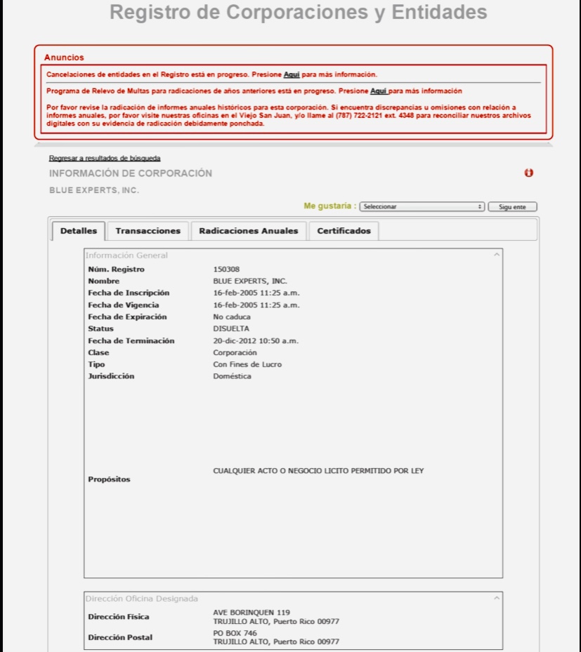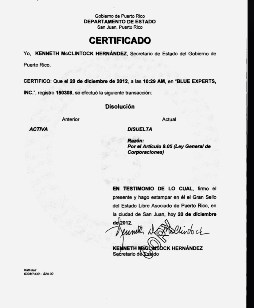 Blue Experts, Inc. se disolvió voluntariamente el 20 de diciembre de 2012. Curiosamente, el contador público certificado que compiló los estados financieros al 30 de noviembre de 2012 fue el Sr. Eduardo Ramírez a/k/a Eduardo Ramírez Flores, de Ramírez Flores & Co., CPAs & Consultants.