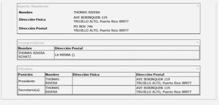 El incorporador, agente residente, presidente y secretario de dicha corporación parecen ser un Thomas Rivera a/k/a Thomas Rivera Schatz, de 119 Calle Borinquen en Trujillo Alto, Puerto Rico, 00976.