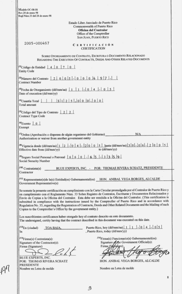 Sobran razones para creer que ni el entonces Gobernador de la Commonwealth [el popular Aníbal Acevedo Vilá] ni los entonces Secretarios de Hacienda y Justicia, ni sus designados, aprobaron el Contrato 2005-000497 entre Blue Experts, Inc., y el Municipio de Toa Baja, ni aprobaron una exención según lo requerido por la ley en virtud de la condición del Sr. Rivera como funcionario público. [Esa es parte de la información a la que pudiera reaccionar si le complace.]