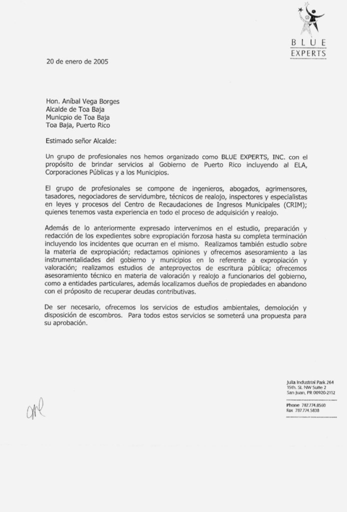 “Por la presente me gustaría informarles de algunos hechos con los que me encontré recientemente mientras investigaba los contratos del Municipio de Toa Baja, Puerto Rico.