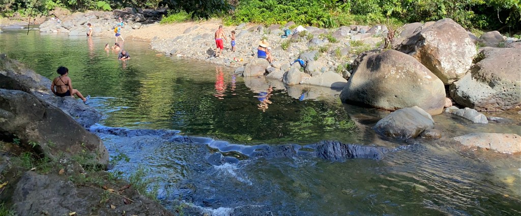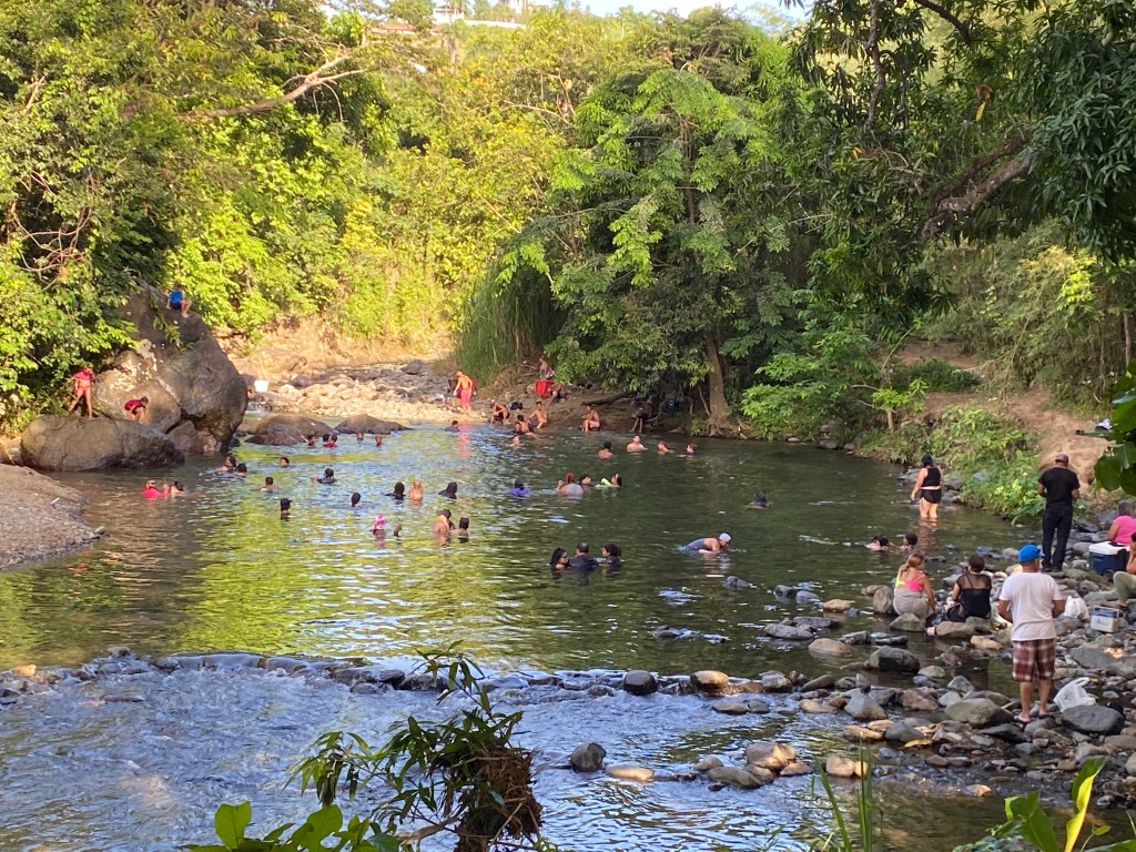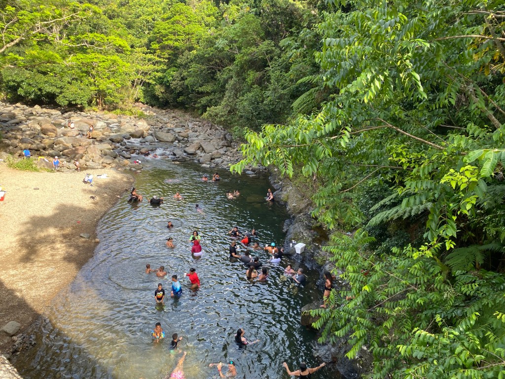 Terminamos en Angelito, como mucha gente, pero no como tantos otros que optan por la Poza del Ángel, localizada abajo en la PR-191, antes de llegar a la urbanización Colinas del Yunque. Allí hubo letreros con la advertencia de aguas contaminadas con bilarsia, aparte de que, presuntamente, descargas de Hacienda Carabalí terminan en la zona del Río Mameyes, al que tampoco se permite acceso libre y sin restricciones de horario a su Charco La Barrigona en la comunidad Barcelona al final de la estatal PR-990, en terrenos propiedad de YMCA San Juan arrendados al negocio Junglequi Zipline.