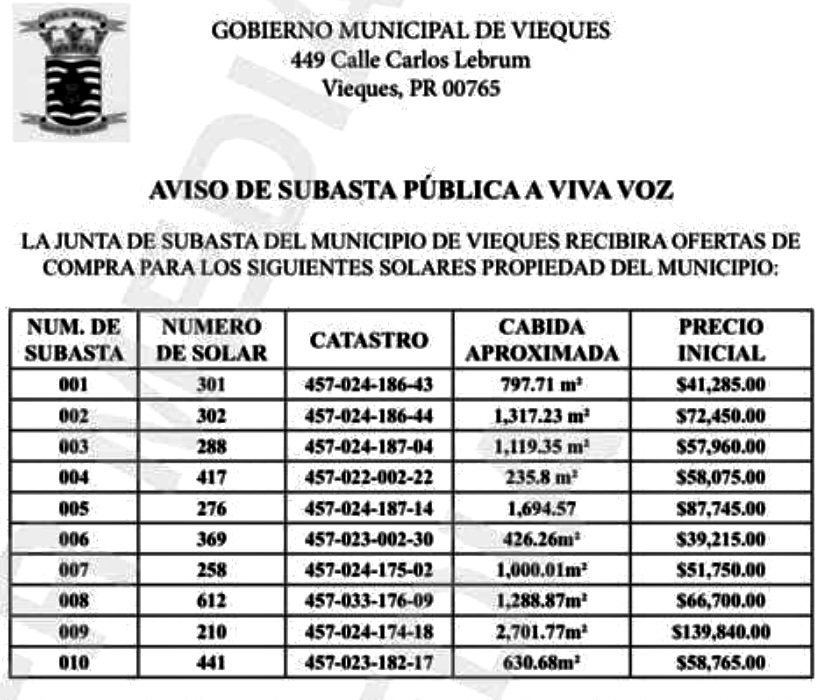 Esta Subasta a Viva Voz se realizará el 6 de julio de 2023 a las 10:00 am en las facilidades del Centro de Usos Múltiples localizado en el primer piso del edificio de la calle Antonio G. Mellado, #375, del municipio de Vieques.