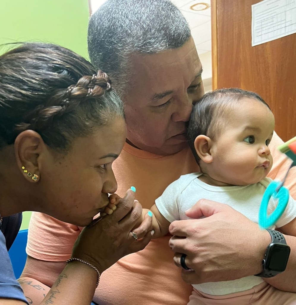 La pequeña Grecia junto a sus abuelos maternos, Brenda González y Gabriel E. Abreu Guzmán. Foto/suministrada por la Familia