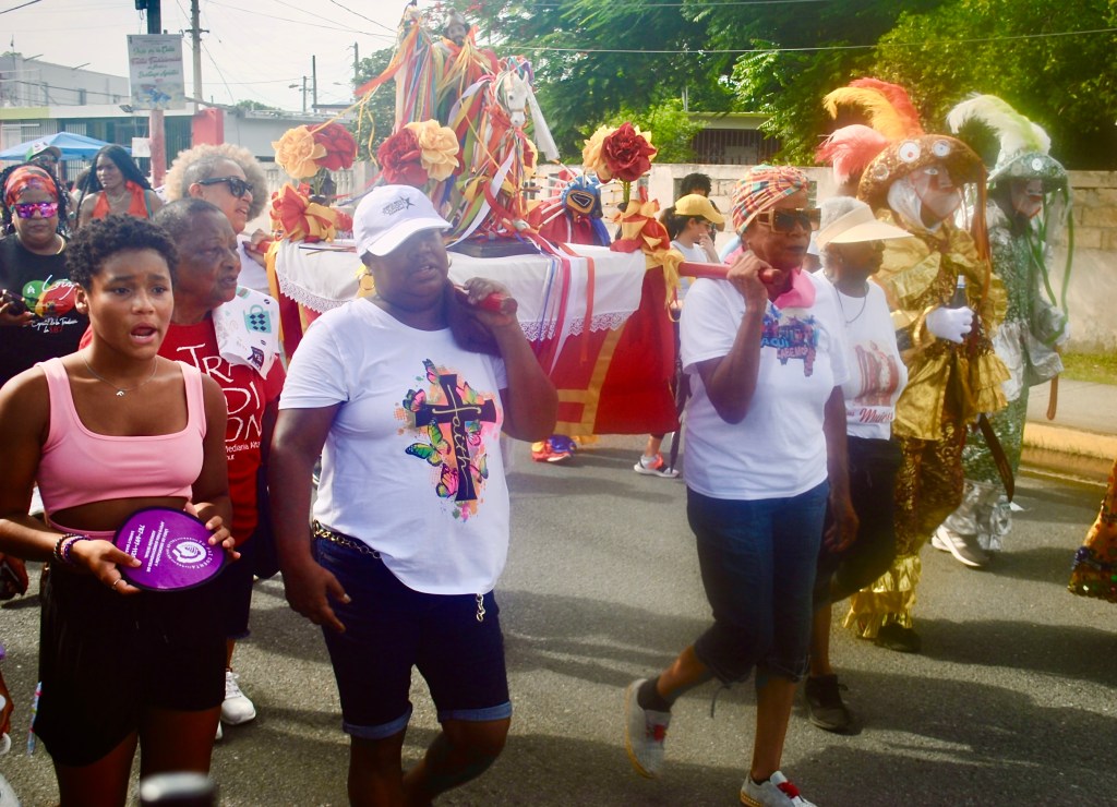 La procesión finalmente recorrió la arteria principal de Las Carreras y metros antes del monumento donde estuvo el árbol de corcho donde apareció la imagen, se tocó y bailó la bomba de Loíza.
