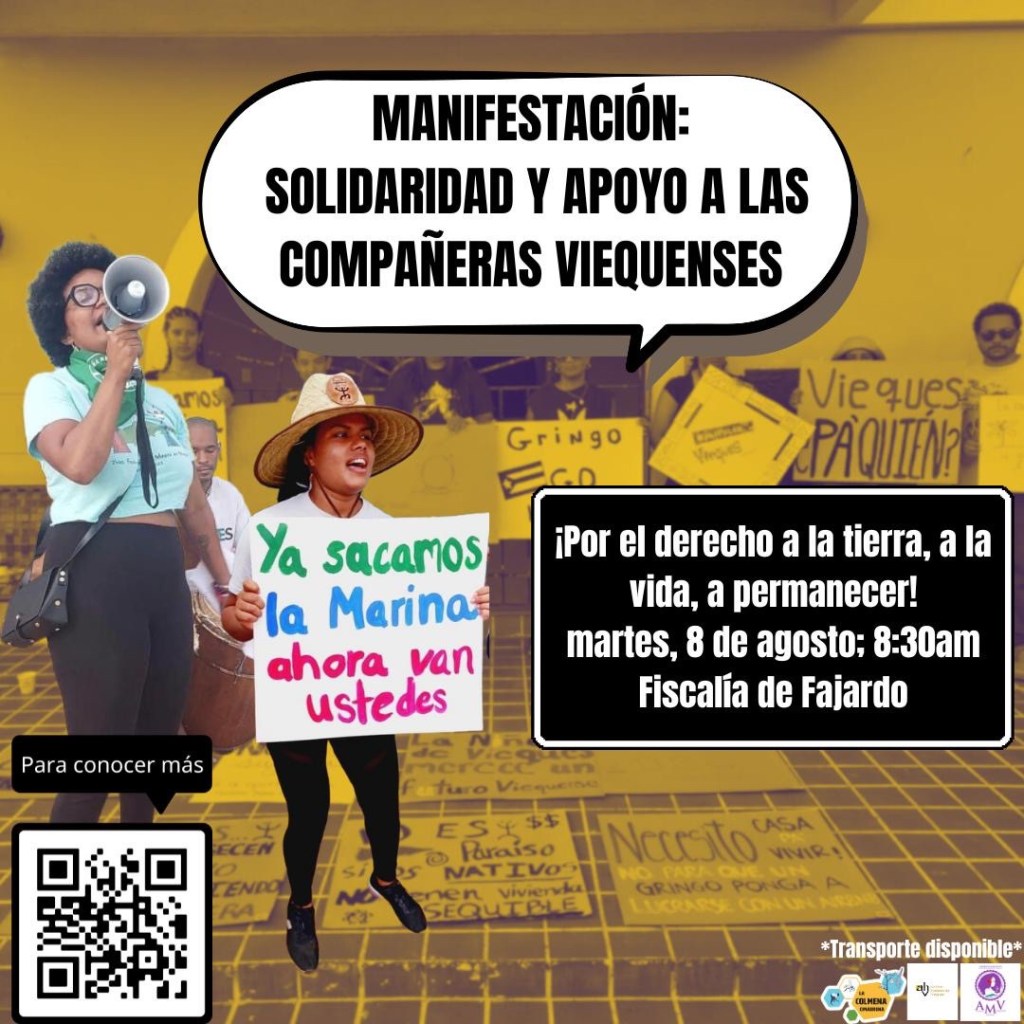 Frente a esto, La Colmena Cimarrona, la Alianza de Mujeres Viequenses y el Archivo Histórico de Vieques les convoca ahora al martes, 8 de agosto a las 8:30am frente la fiscalía de Fajardo para apoyarla y dejarle claro al Estado que ella no está sola.