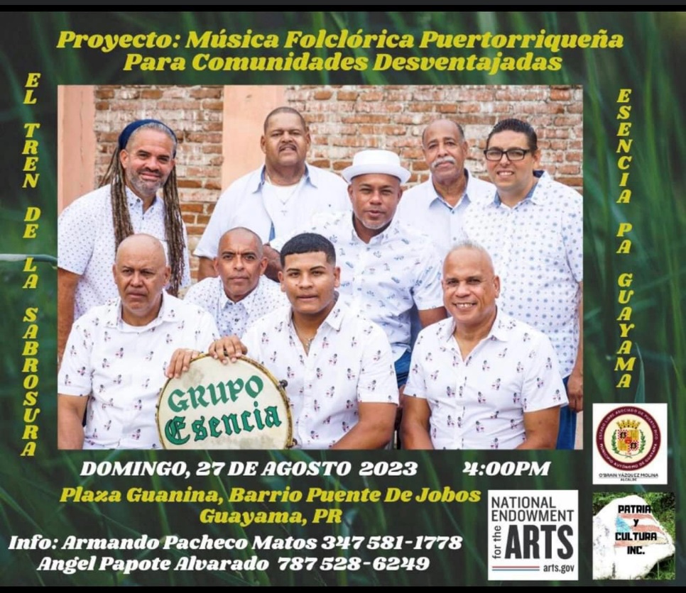El Proyecto: Música Folclórica Puertorriqueña Para Comunidades Desventajadas concluirá con el concierto del Grupo Esencia en la Plaza Guanina del Barrio Puente de Jobos del pueblo de Guayama, el domingo, 27 de agosto de 2023 a las 4:00PM.