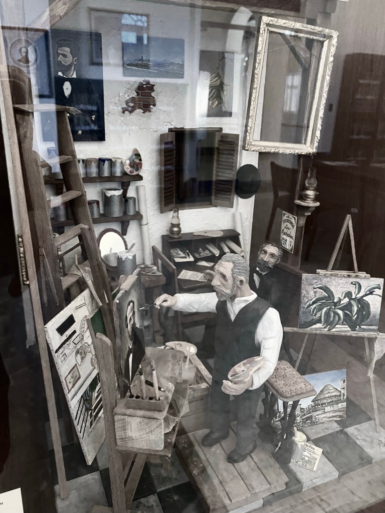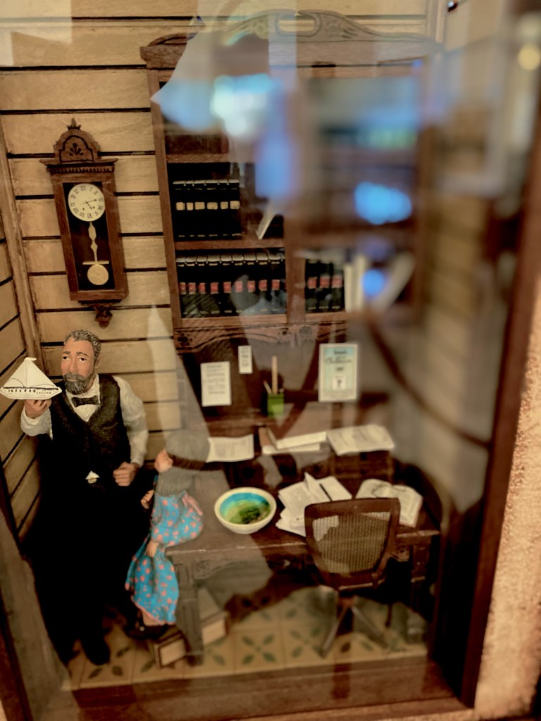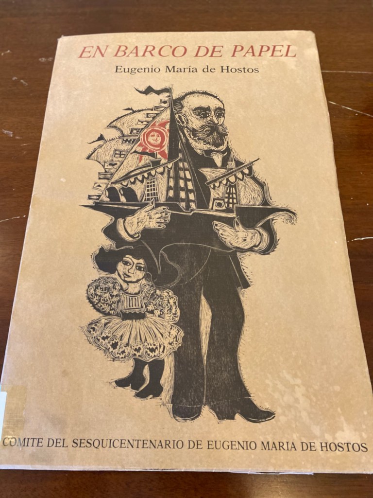 No faltan sus anteojos y libros, por ejemplo “La Peregrinación de Bayoán”, edición de 1873; medallas, cartas a Ramón Emeterio Betances y a otras personas, sus obras completas, fotos, artesanías en miniaturas de Edwin Báez y hasta un ejemplar de su cuento “En Barco de Papel”, escrito en Chile en 1897 y donado por su hija Teresa de Hostos a la sala.