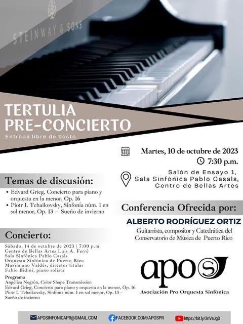 La Asociación Pro-Orquesta Sinfónica (APOS) anunció hoy que ofrecerá su siguiente Tertulia Pre-Concierto el martes, 10 de octubre del presente, en la Sala de Ensayos de la Sala Sinfónica Pablo Casals, del Centro de Bellas Artes de Santurce, a las 7:30 de la noche.