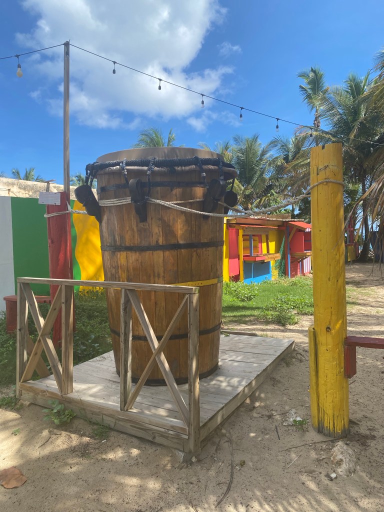 “Hace un año Sheila nos presentó la idea. Pensando en una cisterna de 400 galones, medimos la circunferencia y las tablas. La dueña del tambor también suplió parte de los materiales. Empezamos a buscar tambores en otros países y vimos lo que se ha hecho en Japón y en Haití, con uno que se usa para el vudú. Y decidimos hacer un tambor de bomba a la usanza del siglo XVIII de taquete o cuña con colores naturales, dejándome llevar por la idea de cómo don Rafael Cepeda Atiles montaba sus tambores”, explica Juan Fuentes Molina, cuyo hijo Juan Andrés ayudó, junto a Frank Latorre, en el lijado, cepillado, pintura y amarre del barril de cuero sintético que permanece a la intemperie a pocos pasos de la desembocadura del Río Herrera en el Atlántico.