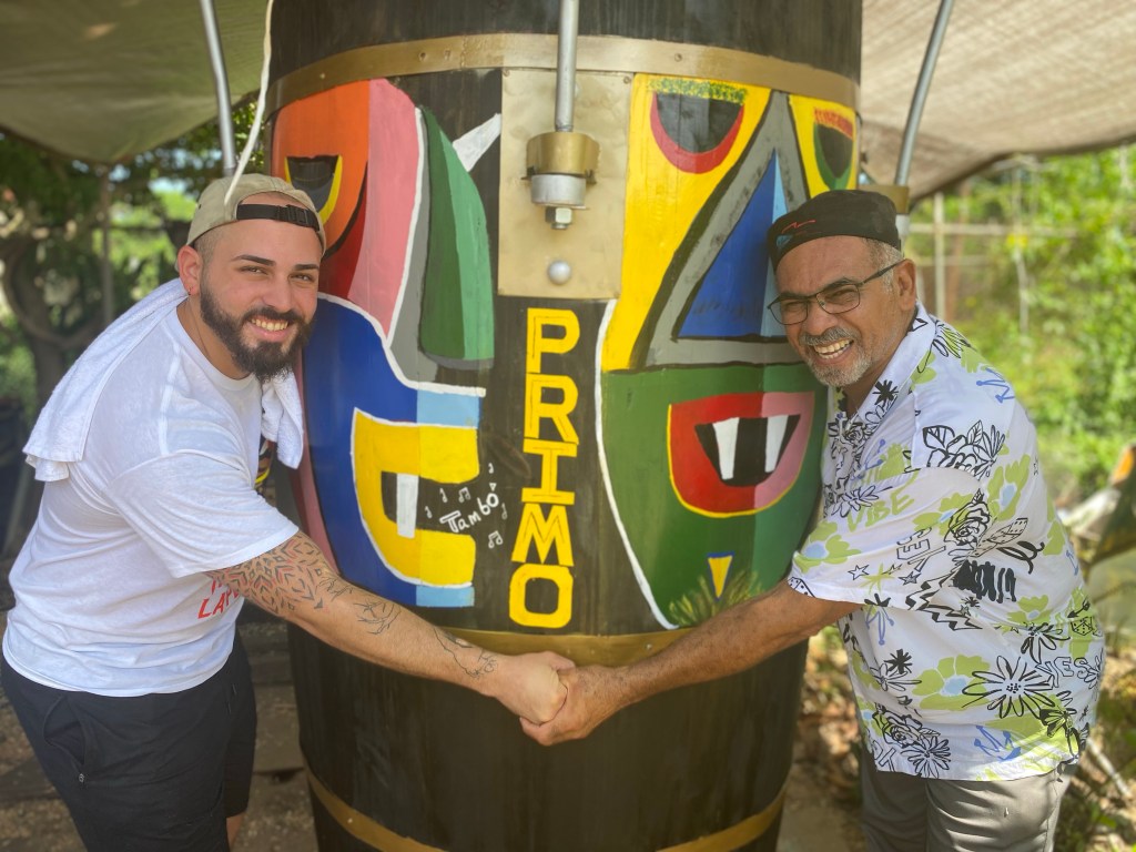 Otro gigantesco barril, nombrado Primo Tambó, de alrededor de casi ocho pies de alto, con la pintura de un vejigante, cáncamos y cuero de vaca, es una de las más recientes creaciones de padre e hijo.