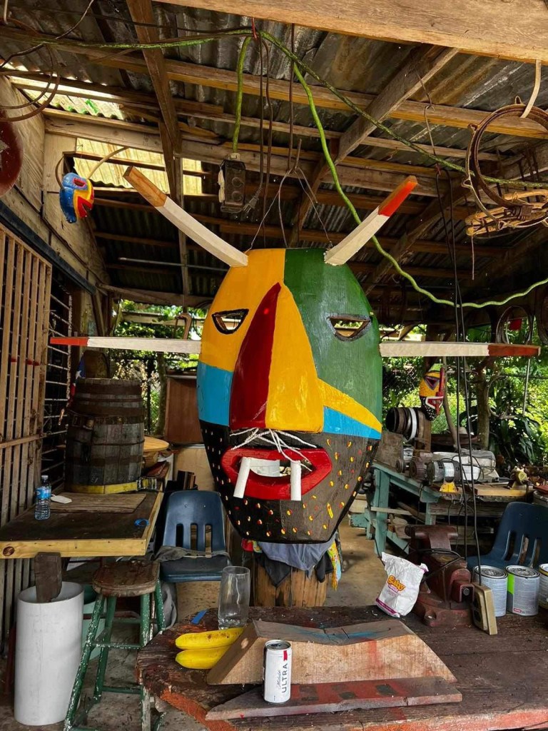 Luego nos trasladamos al Taller La Plena que Juan Fuentes Molina mantiene en el sector La 23 de Mediana Baja, lugar donde ha creado sus tambores y máscaras de vejigantes, pero que por condiciones de salud ya no puede confeccionar con el vigor de antaño, por lo que se siente feliz de que su vástago Juan Andrés siga sus pasos.