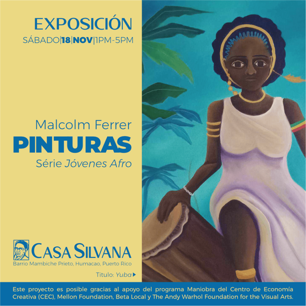 “Pinturas” es la exposición del artista Malcom Ferrer que se presentará en Casa Silvana el este sábado, 18 de noviembre de 1:00 a 5:00pm. como parte de la “Serie Jóvenes Afro”que cumple su primer aniversario de implantación en la promoción de artistas jóvenes emergentes afropuertorriqueños.