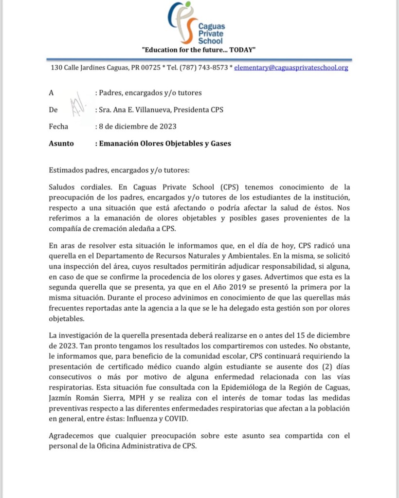 “En aras de resolver esta situación le informamos que, en el día de hoy, Caguas Private School radicó una querella en el Departamento de Recursos Naturales y Ambientales. En la misma, se solicitó una inspección del área, cuyos resultados permitirán adjudicar responsabilidad, si alguna, en caso de que se confirme la procedencia de los olores y gases”, escribió Ana Villanueva.