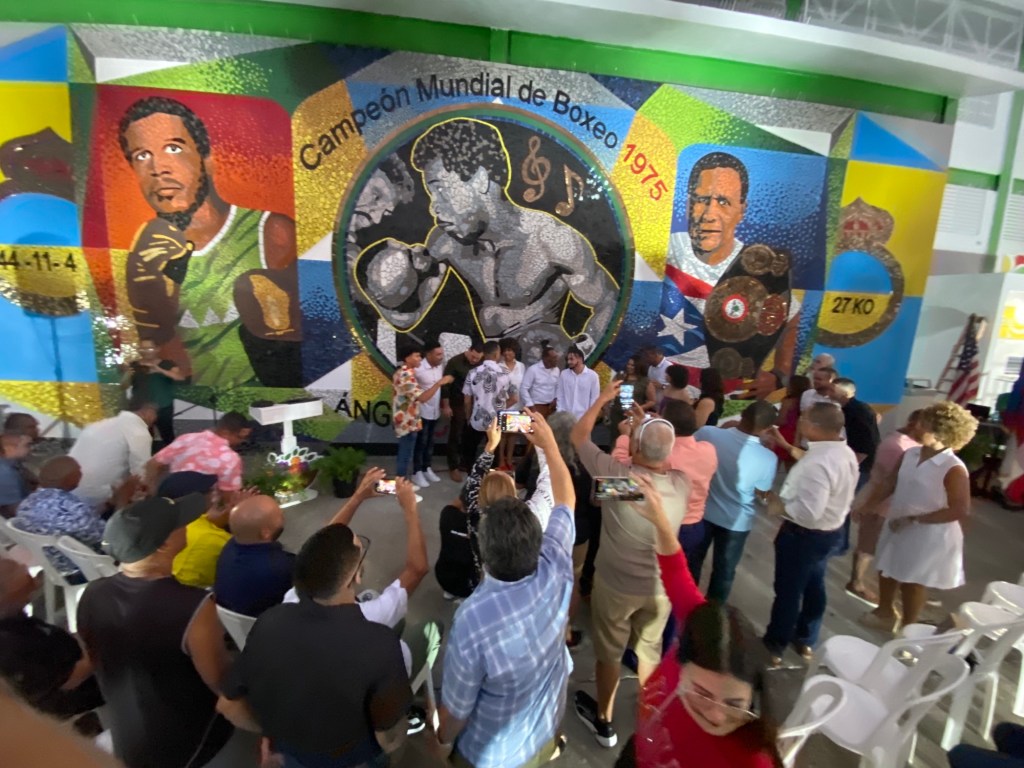 Roberto Biaggi, el creador del mosaico, es también el creador de la obra ‘Infinitos recuerdos de Doña Fela’, frente a la entrada del estacionamiento de El Escambrón en Puerta de Tierra. “Aquel mosaico en San Juan tiene 12 pies x 500 pies de largo, este de Salinas es de 42 x 16 pies. La imagen del centro recrea aquel 28 de junio de 1975 cuando ganó en 15 asaltos a casa llena en el Coliseo Roberto Clemente. Quienes vivieron ese momento van a rememorar esta gran gesta”.
