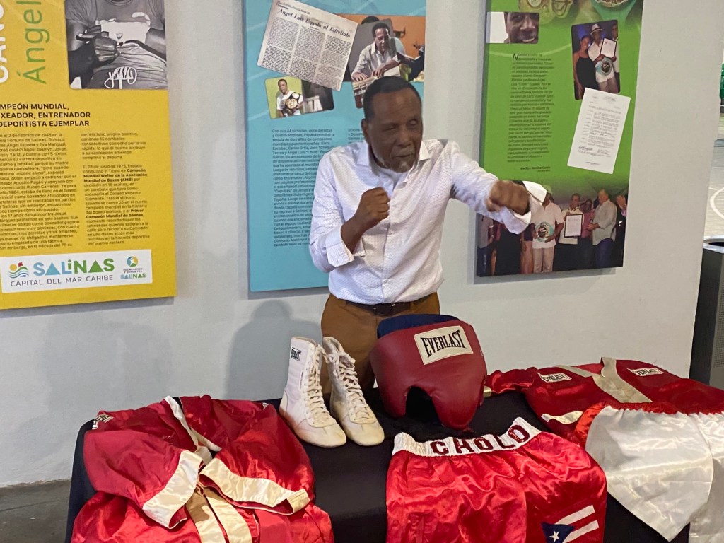 (SALINAS – miércoles, 20 de diciembre de 2023) Ser honrado en vida por su pueblo es un privilegio que no todos los deportistas experimentan, y esa es la experiencia del boxeador de Salinas Ángel Luis ‘Cholo’ Espada Mangual, quien a sus 75 años presenció la develación del mosaico ‘Siempre Campeón’ en la cancha que lleva su nombre, localizada en la intersección con la PR-1 interior, sector Pueblo.