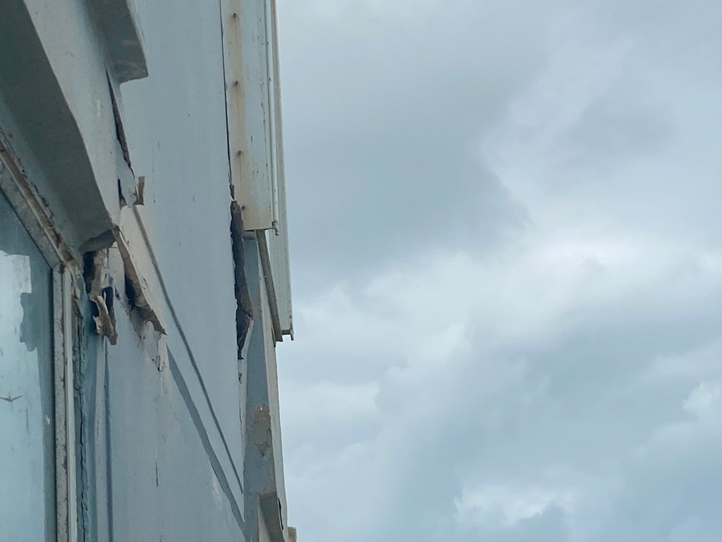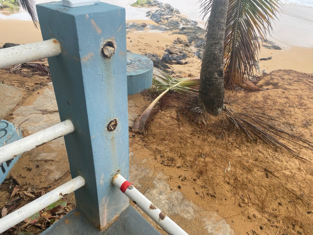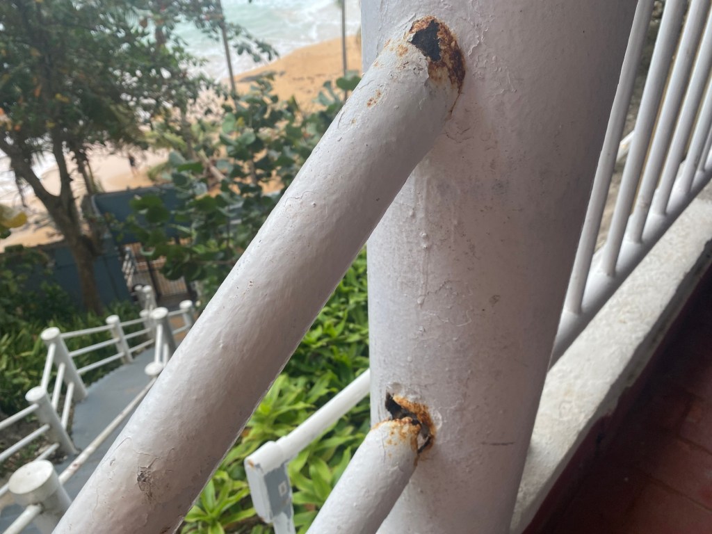 Desde la playa, a simple vista, se ven columnas y pisos con grietas así como barandas, pasamanos y rejas en los balcones desprendidas por la oxidación.
