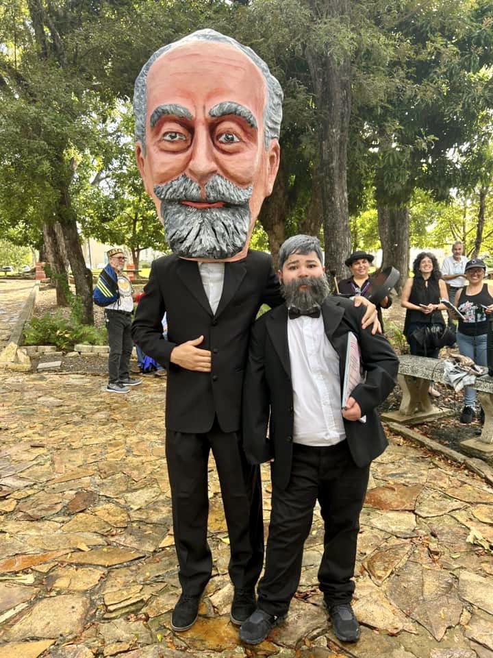 “Fui patriota, educador, sociólogo, filósofo y escritor, reconocido como el Ciudadano de América, siempre buscando educar para la Patria porque ni hoy, ni mañana ni nunca nuestra Patria dejará de ser nuestra”, señaló el jovencito, flanqueado por el cabezudo de Hostos, diseñado por Pedro Adorno, corazón de Agua, Sol y Sereno.