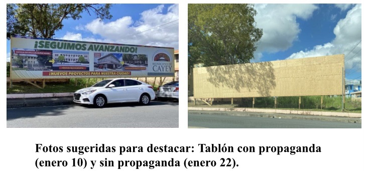 Pero los cayeyanos no vivimos en una ciudad distópica; nadie nos puede embobar con mensajes disonantes ni promesas recicladas. El 10 de enero estuvimos tomando fotos por el pueblo para nuestro editorial publicado el 12 de enero. Ese día tomamos fotos de tres tablones de madera, uno de los cuales contenía la frase de campaña “Seguimos avanzando” junto al logo del municipio. Esto en clara violación a la ley electoral que prohíbe el uso de fondos públicos para pagar propaganda política de candidatos electorales. Valga destacar que el 11 de enero, el Comité del PIP en Cayey publicó en su página de Facebook, la observación sobre los tablones de madera, el calendario y hasta un libro de colorear con propaganda política del alcalde. Algún cayeyano tuvo que haber intervenido de forma oficial, pues ya para el 22 de enero, la propaganda había sido retirada de los tablones.