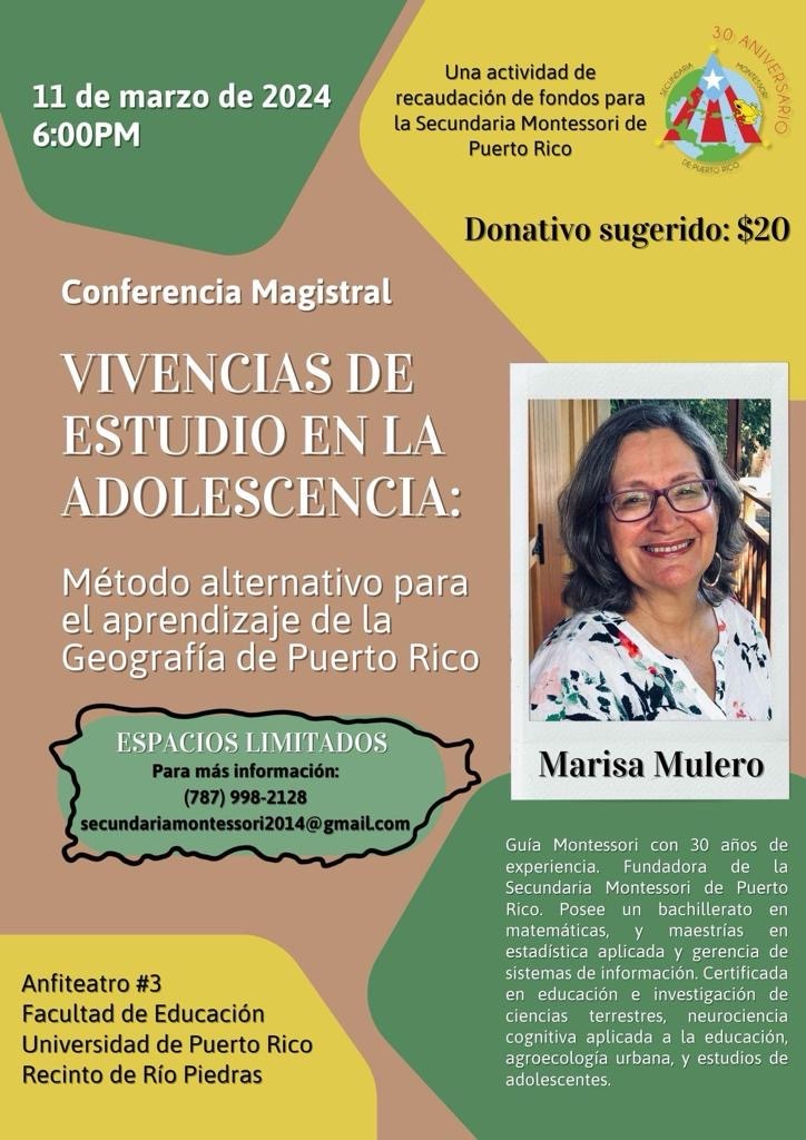 Marisa Mulero, fundadora del primer ambiente Montessori de Erdkinder en Puerto Rico, compartirá sus saberes y experiencias de una de las vivencias de aprendizaje más enriquecedoras y significativas de las que han sido tres décadas laborando con adolescentes: las vivencias de estudio.