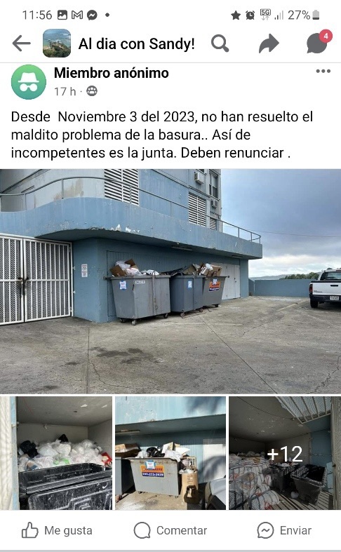 “La Junta no se oye ni se ve. Alegadamente el Presidente creó fricciones con ConWaste, la compañía que había contratado. La basura nos arropa y ahora solo dos veces por semana llega un contratista independiente, de esos que recogen escombros”, dijo un titular que no quiso ser identificado por temor a represalias.