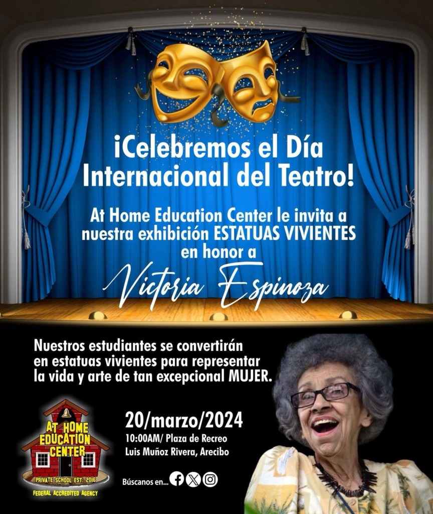 Ramírez Natal explicó que la actividad es dedicada a la profesora, productora y directora teatral, Victoria Espinosa (QEPD). “El mes de marzo se celebra el mes del teatro. Nuestra academia At Home Education Center, imparte clases de teatro como parte de su oferta académica para nuestros estudiantes. La agencia reconoce los grandes aportes en el desarrollo cognitivo y socioemocional que aporta esta rama del arte.”