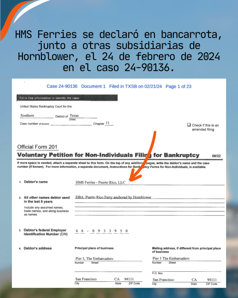 La legisladora explicó que hay documentos que muestran que HMS se declaró en quiebra el 24 de febrero de 2024, mismo día que Hornblower Group y decenas de sus subsidiarias, como parte de un proceso de reestructuración por el cual un nuevo fondo de capital privado adquirirá un interés mayoritario en la compañía matriz.