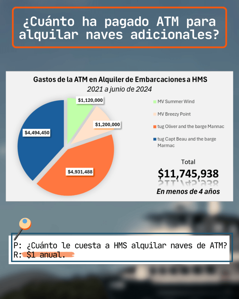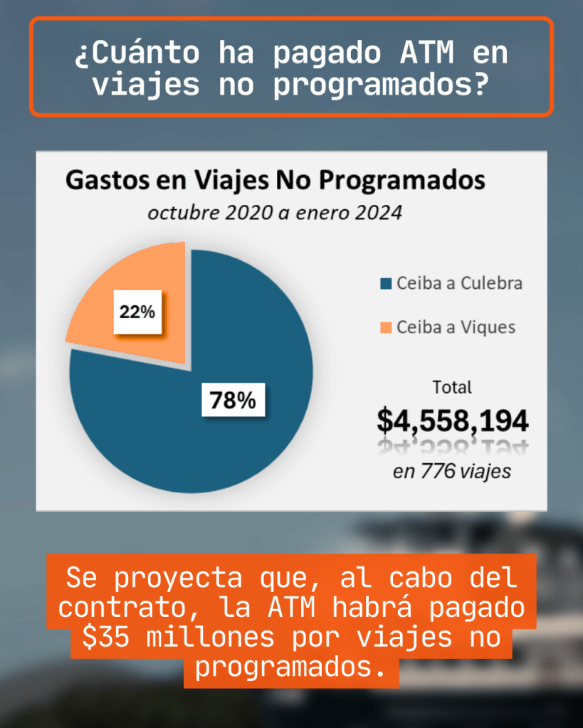 A estos señalamientos se le suma otro número de particulares cuestionables identificados por la oficina de Nogales Molinelli en los múltiples contratos de ATM y HMS Ferries, entre ellos: los 776 viajes no programados que desde el 2020 se han realizado con el financiamiento de ATM y que han representado más de $4.5 millones en gastos hasta el momento; el pago de $400 mil al mes por el uso de una de las barcazas de pasajeros de HMS Ferries; los más de $750 mil en mercadeo que ha gastado ATM en beneficio de HMS Ferries solo durante estos primeros tres años de contrato, entre muchos otros.