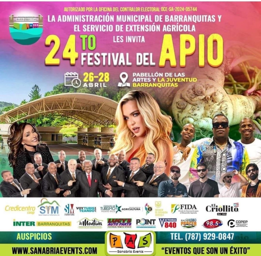 “En auspicios estamos en alrededor de entre $75 y $80 mil y el restante es del municipio. El Festival del Apio se hace desde hace 24 años. Aquí los agricultores y artesanos barranquiteños mueven lo que trabajan y las hospederías se llenan. Es un evento que fomenta la economía”, explica el alcalde al enumerar auspiciadores como Credi Centro, Hospital Menonita, INTER Barranquitas, Compañía de Turismo, Departamento de Agricultura, Colegio de Productores de Espectáculos, Fondo de Innovación para el Desarrollo Agrícola, Radio Prócer y otros.