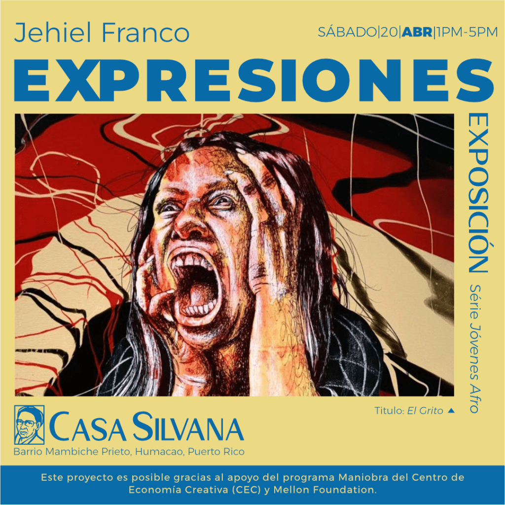 Humacao, Puerto Rico – Casa Silvana continúa con su innovador ciclo de exposiciones “Serie Jóvenes Afro” y presenta este sábado, 20 de abril a la 1:00 pm la obra del novel artista plástico Jehiel Franco Torres bajo el título “Expresiones”.