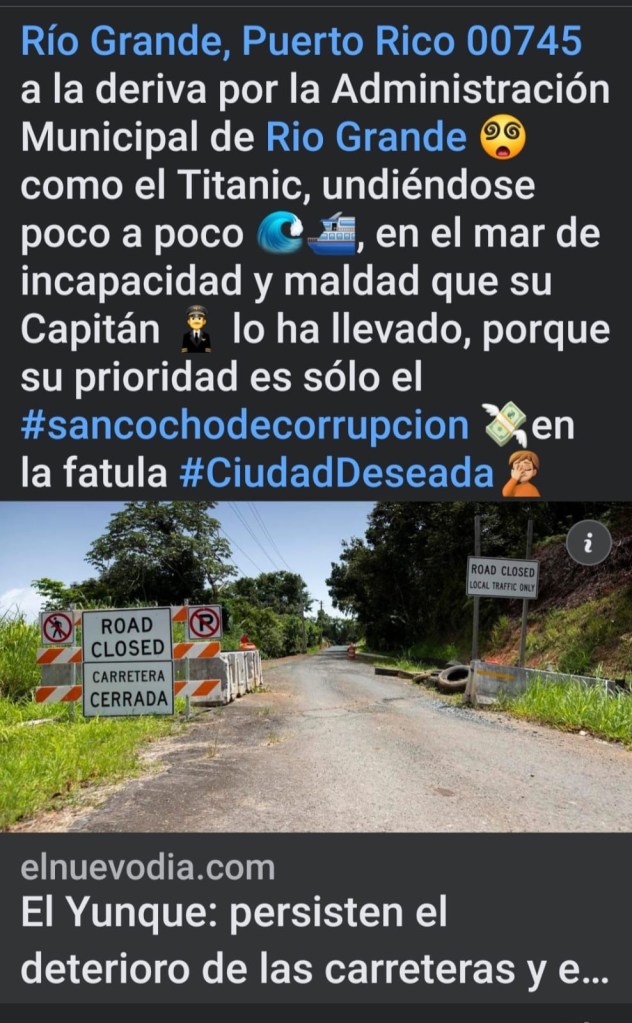 En un comunicado circulado a los medios también dijo que, “irónicamente, aunque Río Grande debería ser un ejemplo de conservación y protección del ambiente, lo cierto es que son múltiples los delitos ambientales que se cometen a diario en la Ciudad de El Yunque”.