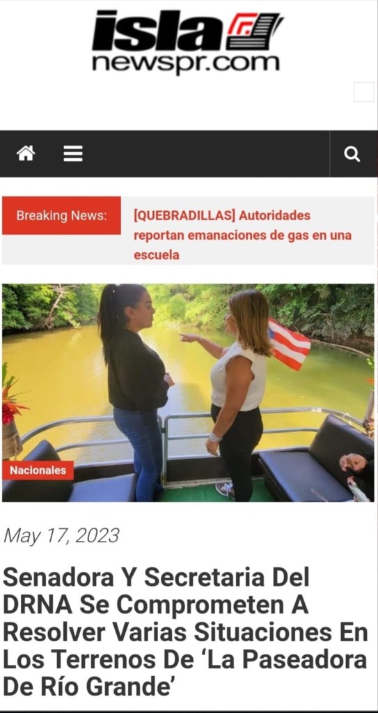 “Es un crimen la forma en que el Alcalde de este pueblo y la Presidente de la AAA, Doriel Pagán, contaminan todos los días, las aguas del río Espíritu Santo, mientras la Secretaria del DRNA navega en paseo turístico con la senadora Marissa Jiménez para adelantar los intereses comerciales del candidato a la Alcaldía por el PNP, quien gestiona una franquicia de esa Agencia, para establecer un negocio de kayaks adyacente a La Paseadora”, señaló Méndez, quien fue Alcalde de este pueblo, entre 1997 y 2000.