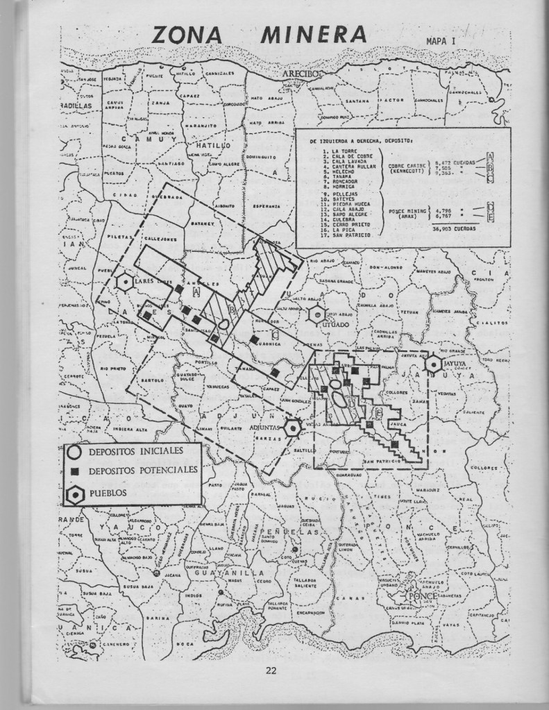 En 1969, las compañías mineras Kennecott Copper Corporation y American Metal Climax hicieron una propuesta conjunta para la explotación a cielo abierto de tres yacimientos y para continuar la exploración en 37,000 cuerdas de terreno en los municipios mencionados. Existen unos 18 lugares adicionales con yacimientos o yacimientos potenciales, algunos de los cuales podrían ser explotables en conjunto con los primeros. (ver Figura 1).