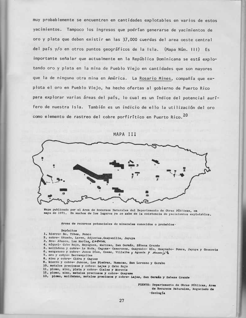 Durante esas décadas, diversas compañías mineras hicieron investigaciones en un gran número de lugares en Puerto Rico. Se intentaba localizar yacimientos de cobre, oro, plata, molibdeno, níquel, cobalto, cromo, hierro, manganeso, cinc, plomo, minerales raros, platino y minerales asociados. (Ver Figura 3)