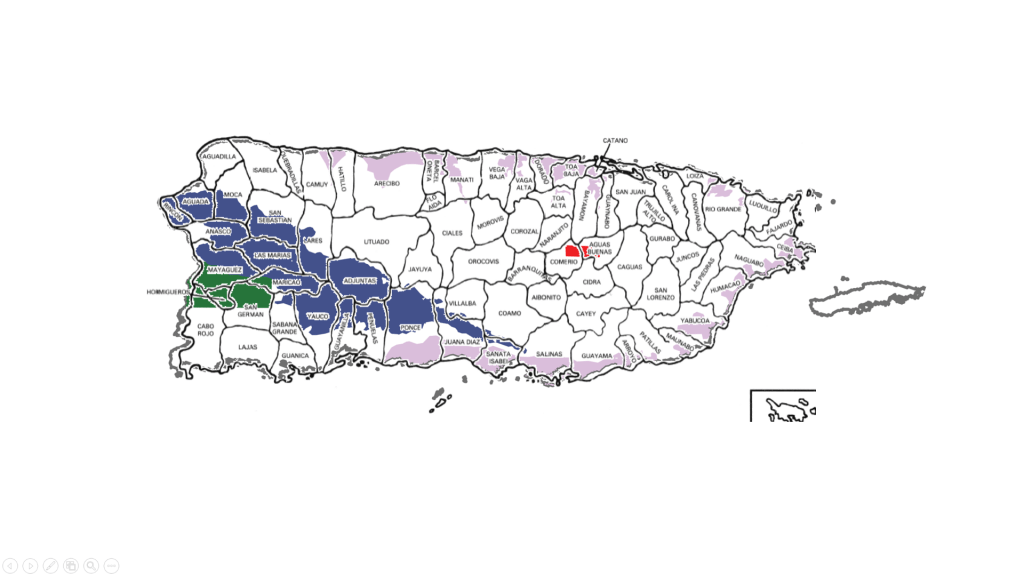 Los círculos que aparecen en el noreste de la Isla Grande incluyen cuadrángulos de investigación en los barrios Buena Vista y Cacao de Carolina. El próximo circulo, corresponde a un cuadrángulo de investigación en el Barrio Cacao de Carolina y el Barrio Quebrada Grande de Trujillo Alto. Los próximos dos círculos hacia el sur corresponden a cuadrángulos de investigación en el Barrio Masas y el Barrio Mamey de Gurabo.