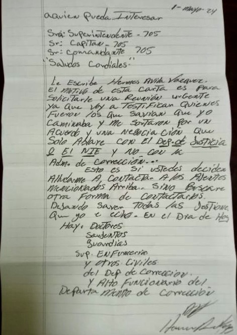 La misiva, escrita a mano por el convicto y asesino, va dirigida a la Superintendente, Capitán y Comandante de la 705 con carácter de urgencia, donde solicita una reunión para delatar a todos los que sabían que él fingía su paraplejia.