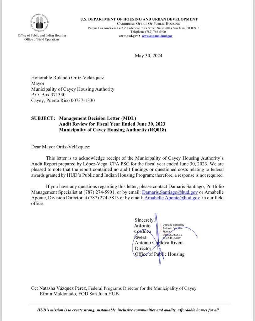 (CAYEY – lunes, 3 de junio de 2024) El alcalde de Cayey, Rolando Ortiz Velázquez, informó que la pasada semana recibió una misiva de Antonio Córdova, director de Vivienda Pública (Public Housing), del Departamento de la Vivienda y Desarrollo Urbano de Estados Unidos (HUD, por sus siglas en inglés, quien certificó que luego que una auditoría de rigor realizada por la firma de contadores públicos autorizados López-Vega PSC, no hubo hallazgos en contra del Municipio en el manejo de los fondos asignados.
